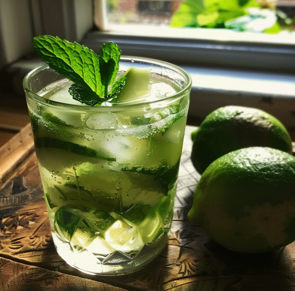 Mélangez du jus de concombre frais avec du jus de citron vert et des feuilles de menthe. Ajoutez de l’eau gazeuse pour rafraîchir.