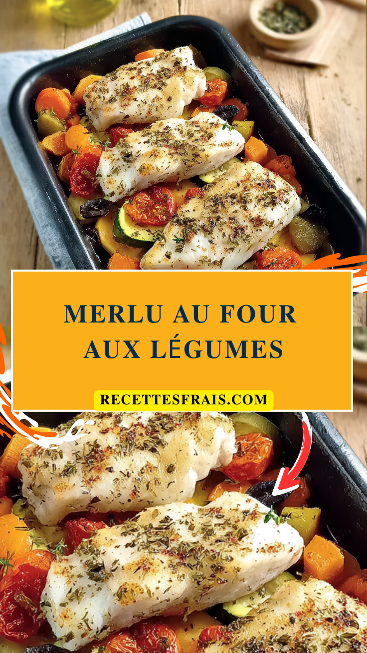 Un plat savoureux et équilibré de merlu accompagné de légumes frais, cuit au four pour une harmonie parfaite des saveurs.